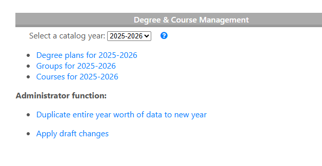 Notice that all of our "Degree & Course Management" data is associated with a catalog year. In most places throughout FlightPath, catalog years will be saved with only the leading year. For example, for 2025-2026 will be saved and displayed to administrators as simply 2025.