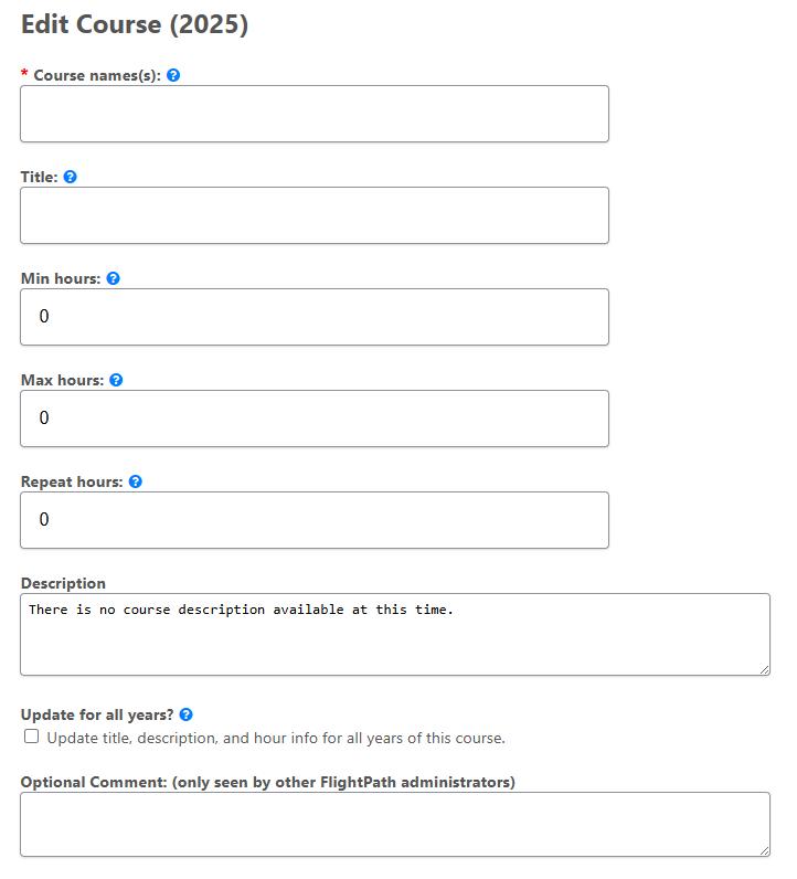- This is a simple text box where you can leave notes for yourself or other FlightPath admins about the course. It will not be visible to students or regular faculty/staff/advisors, etc.