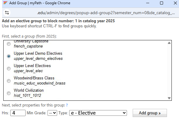 With the "Upper Level Demo Electives" group selected, enter "4" for the number of hours, and set Type to "e - Electives". Then click the Add group button.