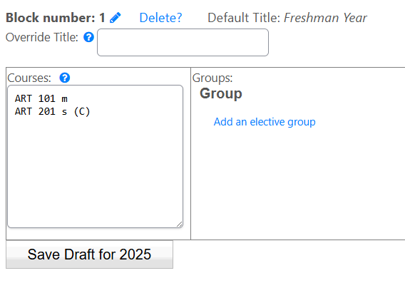 Within each block, we can specify courses to take, and/or elective groups.
