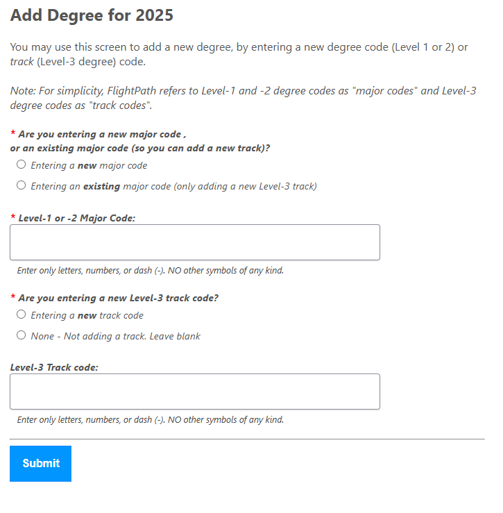 Regardless of the Level number, all degree plans must have a unique "major code." That's how we describe the code in FlightPath, even if it is not actually a "major".