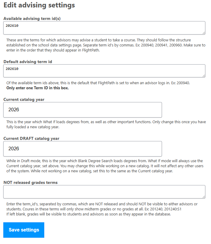 These values are used throughout FlightPath, and are very important for the functioning of the system.